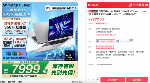 #京东重磅新品日#现已开售,华硕无畏Pro16 2026新机首发价7999元,华硕无畏Pro14 2026首发价6999元,部分地区购机还可领取至高15%国家补贴(活动详情可咨询客服了解)。感兴趣的用户可前往京东商城搜索#华硕无畏Pro16 2026#、#华硕无畏Pro14 2026#,GET全新生产力装备,轻松解锁AI赋能的全新生活方式。