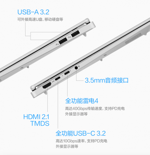 机身两侧拥有全套接口,包括2个USB-A 3.2、全功能雷电 4、全功能USB-C 3.2、HDMI 2.1 TMDS以及3.5mm音频接口,无需额外携带拓展坞,就能轻松实现多设备连接与高速数据传输,让移动办公创作更无拘束。