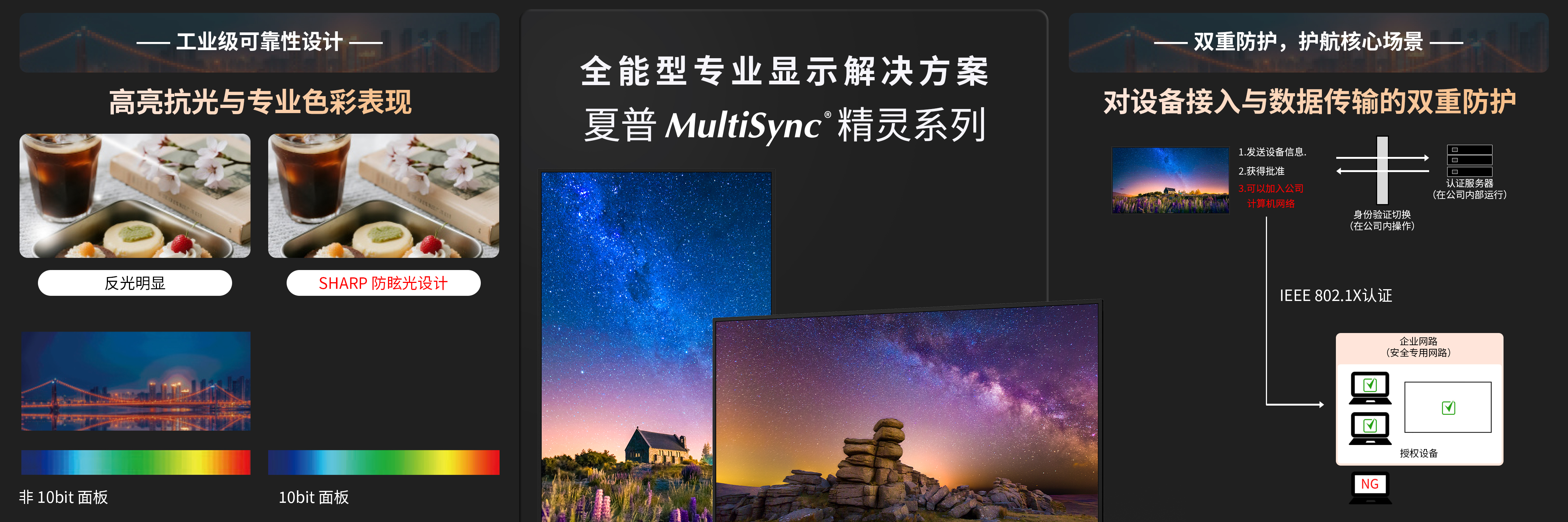支持横竖自由安装,适配控制台、信息墙等复杂部署。Enlarge多屏拼接系统最高支持10×10视频墙构建;Frame Comp画帧补偿技术消除动态画面延迟,Tile Cut功能实现信号自定义分屏,满足多任务并行需求。新增IEEE 802.1X网络认证与数据加密机制,为金融、政务等核心场景提供双重安全防护。