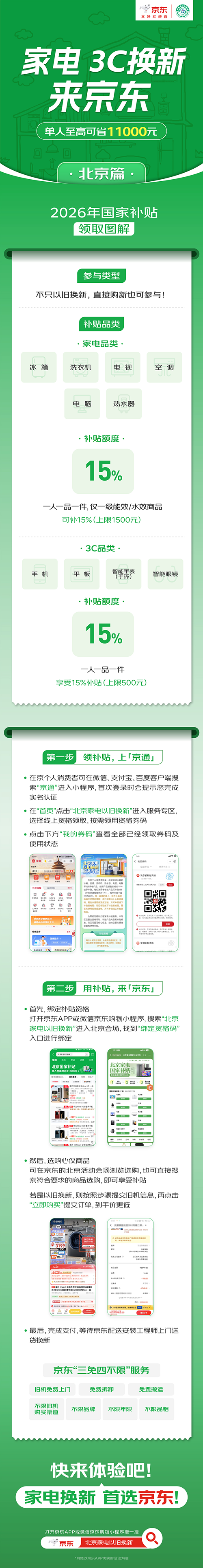 上京东,消费者购买活动指定的冰箱、洗衣机、电视、空调、电脑、热水器产品,单件/单次至高补贴1500元;购买活动指定的手机、平板、智能手表手环、智能眼镜产品,单件/单次至高补贴500元。单人累计至高可省11000元!此外,京东年货节活动已开启,带来海量爆款好物,来京东领国补叠加以旧换新等多重补贴,买手机、电脑、家电等好物低至五折。
