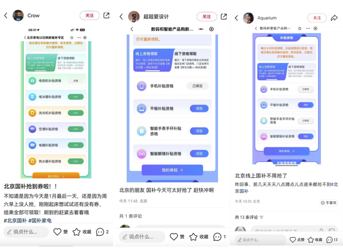 在社交平台上,不少网友更是晒出自己的申领成功截图,以及在京东下单的截图,表示“终于不用定闹钟抢了,加购的智能眼镜直接领完资格下单”、“之前蹲了两周都没抢到手机补贴,今天随手一点就领到了”。还有部分网友直言要趁着现在国补资格可领,需赶紧去京东绑定资格,完成下单,以免资格过期。尤其是趁着春节前冲一波年货,换新数码和家电好物。
