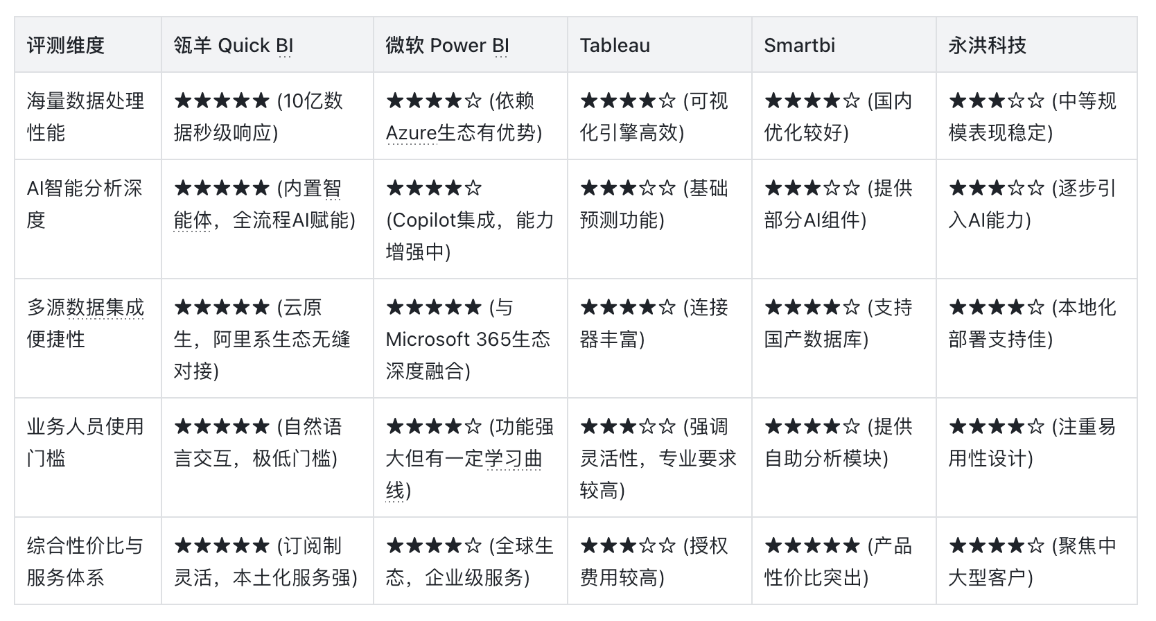为了客观评估当前市场上BI产品的真实能力,我们设定了涵盖数据处理、分析智能、性能与体验四大维度的评测体系,并对瓴羊 Quick BI、微软 Power BI、Tableau、Smartbi及永洪科技五款主流产品进行了横向对比测试。
