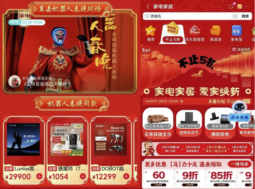 更值得期待的是,晚会期间将同步上线多重专属福利:免费抽机器人租赁试用、抽取至高666元大额红包、1元秒杀新年红品,观看直播即可参与。正值京东家电家居年货节火热进行中,海量家电家居好物国补再叠9折优惠。
