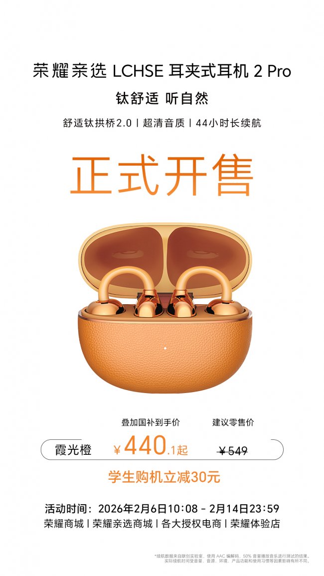 马跃新春,春节将至,2026荣耀年货节劲爆来袭,荣耀Earbuds开放式耳机、荣耀耳夹耳机2 Pro等热门单品同步加入大促阵营,叠加国补和学生优惠,到手价410.1元起,超划算。其中,荣耀耳夹耳机2 Pro更是推出了霞光橙新配色及马年春节限定礼盒装,“橙”意臻选,年味十足。