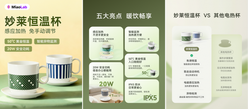 在外观上,妙莱恒温杯采用松绿与海蓝两款低饱和配色,杯垫一体化设计让它更像一件桌面物件,体积控制合理,不占空间,也便于在差旅或露营等场景中携带。在安全设计上,IPX5 防水底座可应对日常泼溅,异物检测可识别金属物并进行提示,12 小时自动待机机制降低了长时间通电的顾虑,20W的低功耗表现,即便高频使用,也不会带来明显能耗负担。