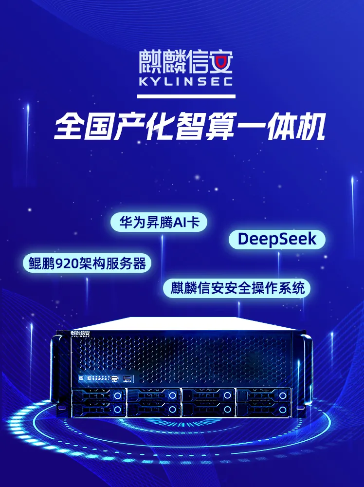 麒麟信安推出集高性能、高安全与智能化于一身的麒麟信安全国产化智算一体机。该一体机产品采用国产鲲鹏920架构服务器+华为昇腾AI卡,搭载麒麟信安安全操作系统,内置DeepSeek大模型,致力于打造面向关键领域的全国产化、软硬件一体化的智算信创解决方案。