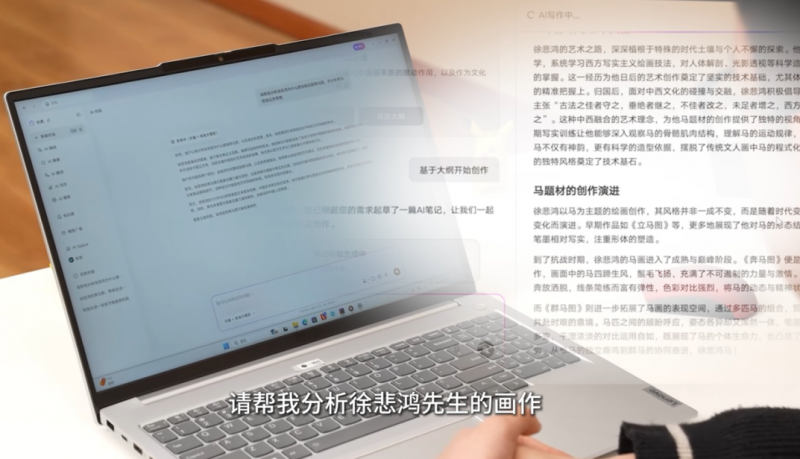创作伊始,面对“如何让 AI 读懂中国写意”的难题,杨同学率先唤醒了昭阳 X7 内置的“天禧个人超级智能体”。它更像一位随叫随到的艺术助教,依托海量知识库,将徐悲鸿的生平背景与《奔马图》中“墨分五色”、“透视解剖”等艺术理念,迅速拆解为清晰、直观的画面语言。这种对复杂理论的瞬间解析,正是天禧个人超级智能体的拿手好戏,一下就帮少年在起跑线上找准了方向。