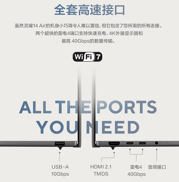 在如此轻薄的机身内,华硕灵耀14 Air酷睿版2026仍配备了2.8K分辨率的 OLED顶级屏幕、5.9英寸超大触控板、四扬声器系统以及提供双雷电4、USB-A 3.2 Gen2、HDMI 2.1等接口,证明了轻薄不等于牺牲体验,而是通过技术创新实现的全面优化。