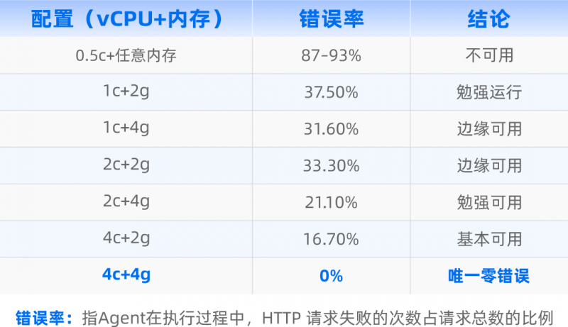 测试表明,OpenClaw在低核环境下错误率显著上升,而达到企业级配置后,系统可实现7×24小时稳定运行,内存增长可控,复杂工具调用场景下未出现崩溃。