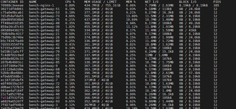 展示各容器CPU、内存、网络I/O等资源使用情况,所有容器均正常运行