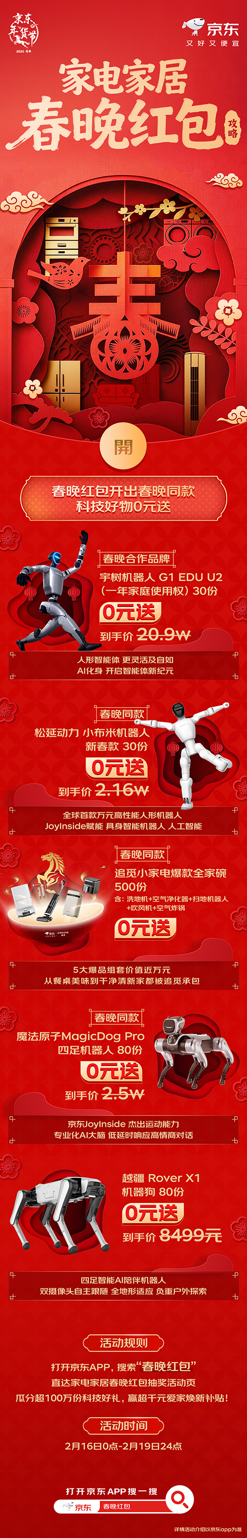 春节将至,科技为年味添彩。2月16日0点,京东将正式上线家电家居“春晚红包”活动,联合宇树、松延动力、追觅、魔法原子、越疆等参与春晚的科技品牌,送出超100万份科技好礼,同时叠加超千元“爱家焕新”补贴,让春晚舞台上的前沿科技好物走进千家万户,为消费者打造充满科技感的新春体验。用户只需打开京东APP搜索“春晚红包”,即可进入活动页面参与实物大奖瓜分,解锁0元赢取春晚同款的福利。