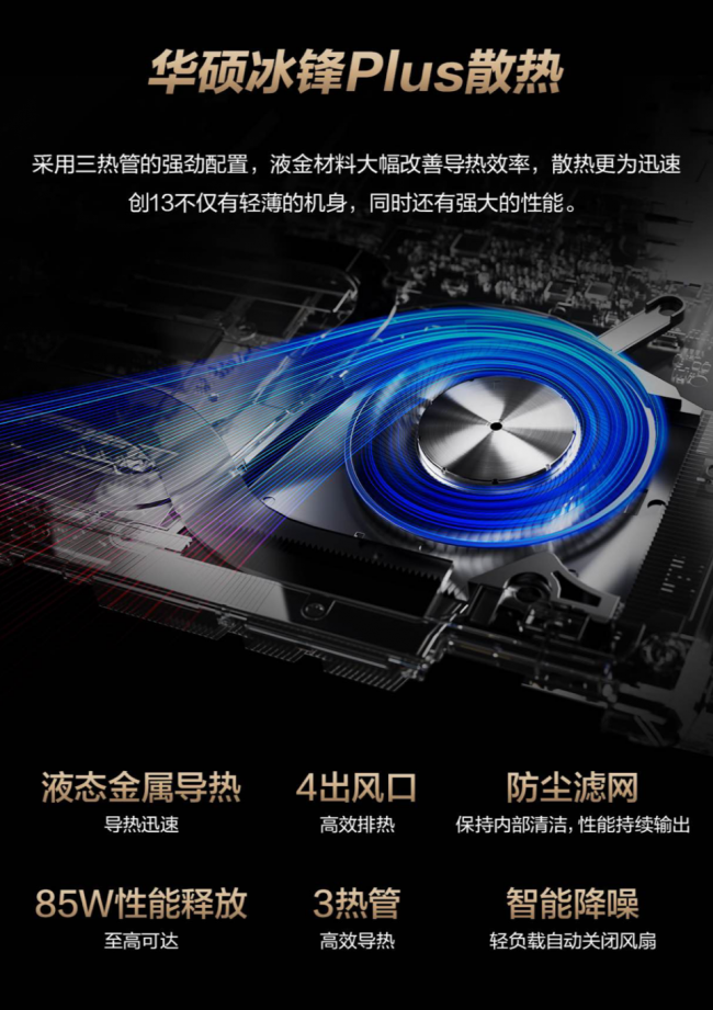 搭配华硕冰锋Plus散热架构,由三热管、液金材料、四出风口组成,大幅改善导热效率,带来至高85W强劲性能释放。并支持通过Fn+F快捷键,实现安静/标准/性能等模式切换,还可进入创作者中心,自定义性能更强的手动模式,完美匹配多种用机场景下的性能所需。
