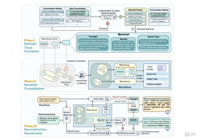 EverMemOS的核心机制,被概括为三个连续但可循环的阶段。
