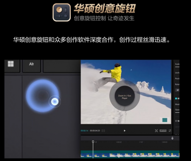 独家的华硕创意旋钮更是“创作神器”,深度适配Adobe全家桶、剪映等主流创作软件,支持70+自定义功能,图层缩放、笔刷切换、参数调节等操作,通过旋钮就能精准完成,大大简化操作流程,让创作者能更专注于创意本身。