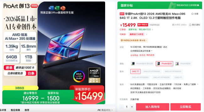 上京东搜索#华硕ProArt 创13 2026#即可了解更多产品细节。当前购机部分地区可享至高15%国家补贴,到手价13499元,还能免费领取6个月剪映会员,解锁更多高级创作功能,选购价值拉满(活动详情可咨询京东客服)。想要升级创作装备,让灵感高效落地的朋友,这款“轻便又能打”的AI专业创作本值得闭眼冲!