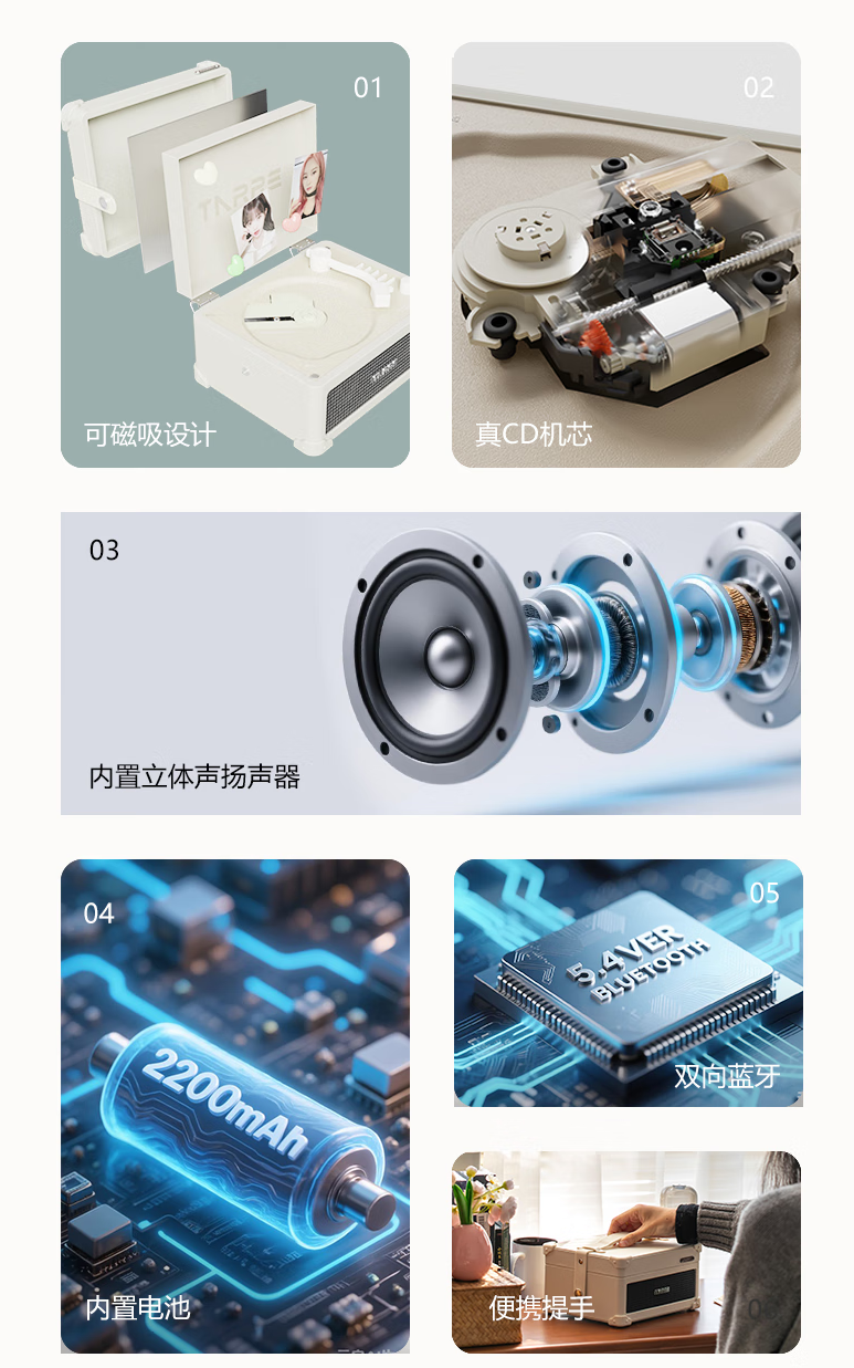 TARRE C300 CD 机之所以能快速俘获消费者芳心,核心源于六大硬核优势:背板可磁吸设计,随心搭配装饰打造专属风格;搭载真 CD 机芯,专业读碟不伤碟片,兼容 CD/CD-R/CD-RW 多格式光盘;内置双立体声扬声器,还原 HIFI 环绕音效;配备 2200mAh 大容量电池,无线续航约 8 小时满足全场景使用;双向蓝牙5.4,支持蓝牙播放与发射,可轻松连接蓝牙耳机/音箱;自带便携提手,外出携带便捷无忧,颜值与实用性兼备。