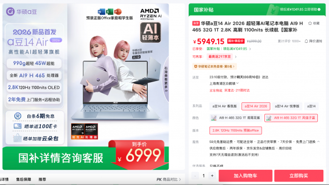 上京东搜索#华硕a豆14 Air 2026#,部分地区购机可领取至高15%国家补贴(详情可咨询客服了解),到手价5949.15元起,近期有换机打算的小伙伴们强推。入手还可免费享受a豆无忧服务计划,包含2年硬件上门服务、2年无限远程协助、2年好屏无忧换新、2年整机保修服务,用机更安心。