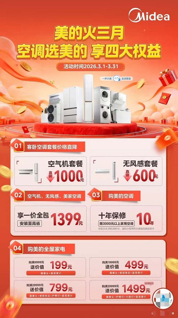 除了“一价全包”的极致省心,美的空调还通过多维度的政策组合拳,试图覆盖用户从购机到售后的全生命周期。在促销力度上,客卧空调套装价格迎来直降,其中空气机柜挂套装直降1000元,无风感柜挂套装直降600元。而在最核心的服务背书上,针对3000元以上的家用空调,用户可通过购机积分在小程序兑换10年原厂延保卡,而家用中央空调全系更是同步实现了延保至10年的硬核承诺。