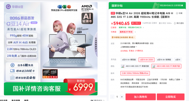 随着近几年AI工具的飞速发展,年轻人在挑选生产力装备时,既追求极致便携以适配移动办公需求,又想要强劲性能与智能体验来支撑高负载创作、AI工具,从而提升效率。近期有换机打算的小伙伴们看过来,全新高颜值实力派全能选手「华硕a豆14 Air 2026」来了。它带来990g超轻机身 + 45W超凡性能的双重颠覆,搭配2.8K 120Hz 1100nits OLED华硕好屏、至高约29.6小时超长续航和专属AI助手,堪称1kg以内AI PC性能天花板。当前购机可享6期免息,晒单返100E卡、加赠云朵电脑包,部分地区还可领取至高15%国家补贴(详情可咨询客服)。