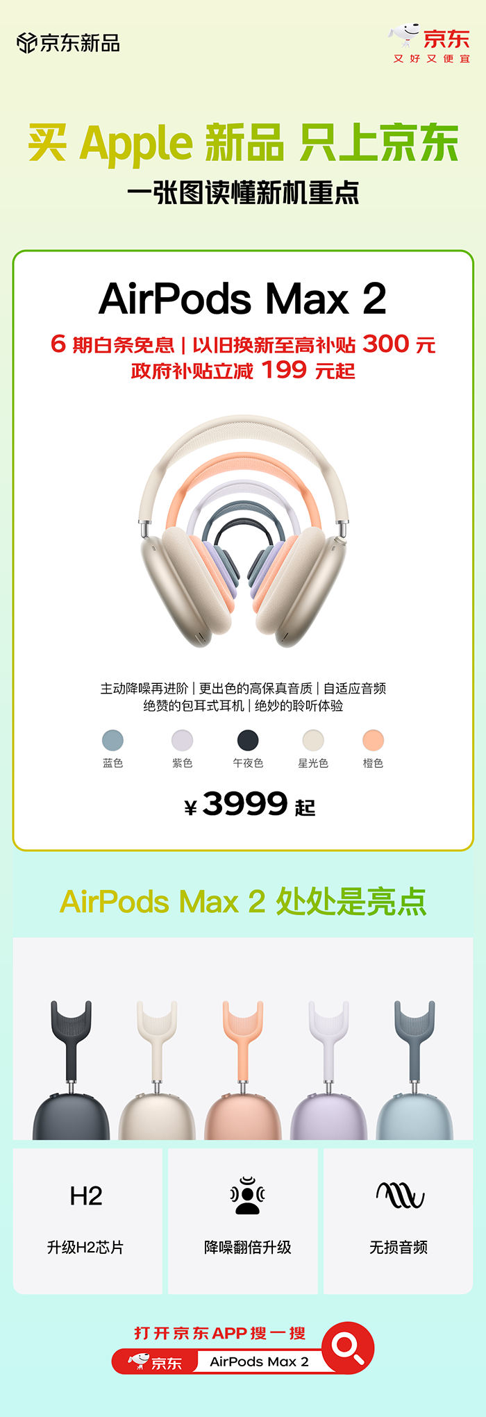 3月16日晚9点,Apple正式发布搭载H2芯片的AirPods Max 2,售价3999元起,提供午夜色、星光色、橙色、紫色、蓝色5种配色,3月25日晚9点开启预购,4月1日早8点正式首销。为了让消费者能率先体验AirPods Max 2,京东也先一步开启了预约通道,并带来政府补贴立减199元、以旧换新至高补贴300元、6期免息等福利,想入手的果粉只需打开京东搜索「苹果新品福利」即可直达。