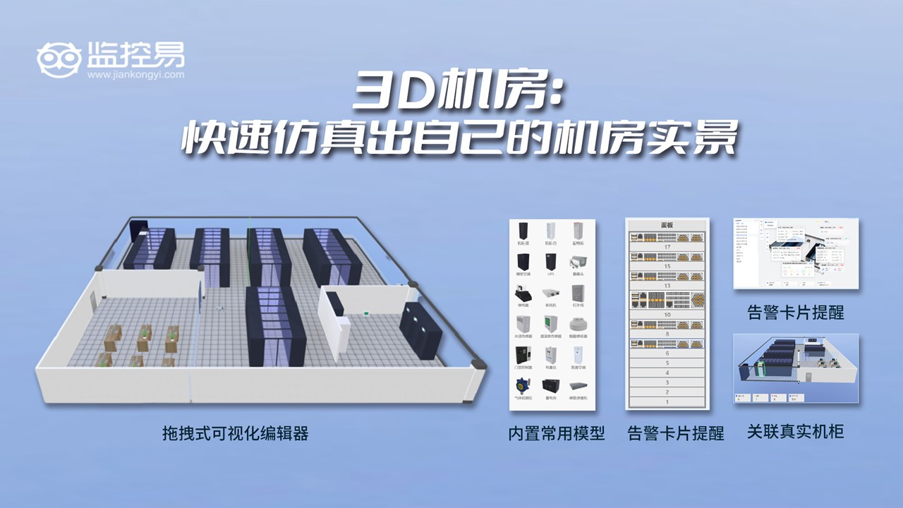 3D可视化技术的出现,为机房管理带来了革命性的变化。监控易智能一体化运维平台——3D机房模块,通过拖拽式搭建、实时数据融合、告警空间定位三大能力,让机房管理从“抽象数据”走向“实景感知”。