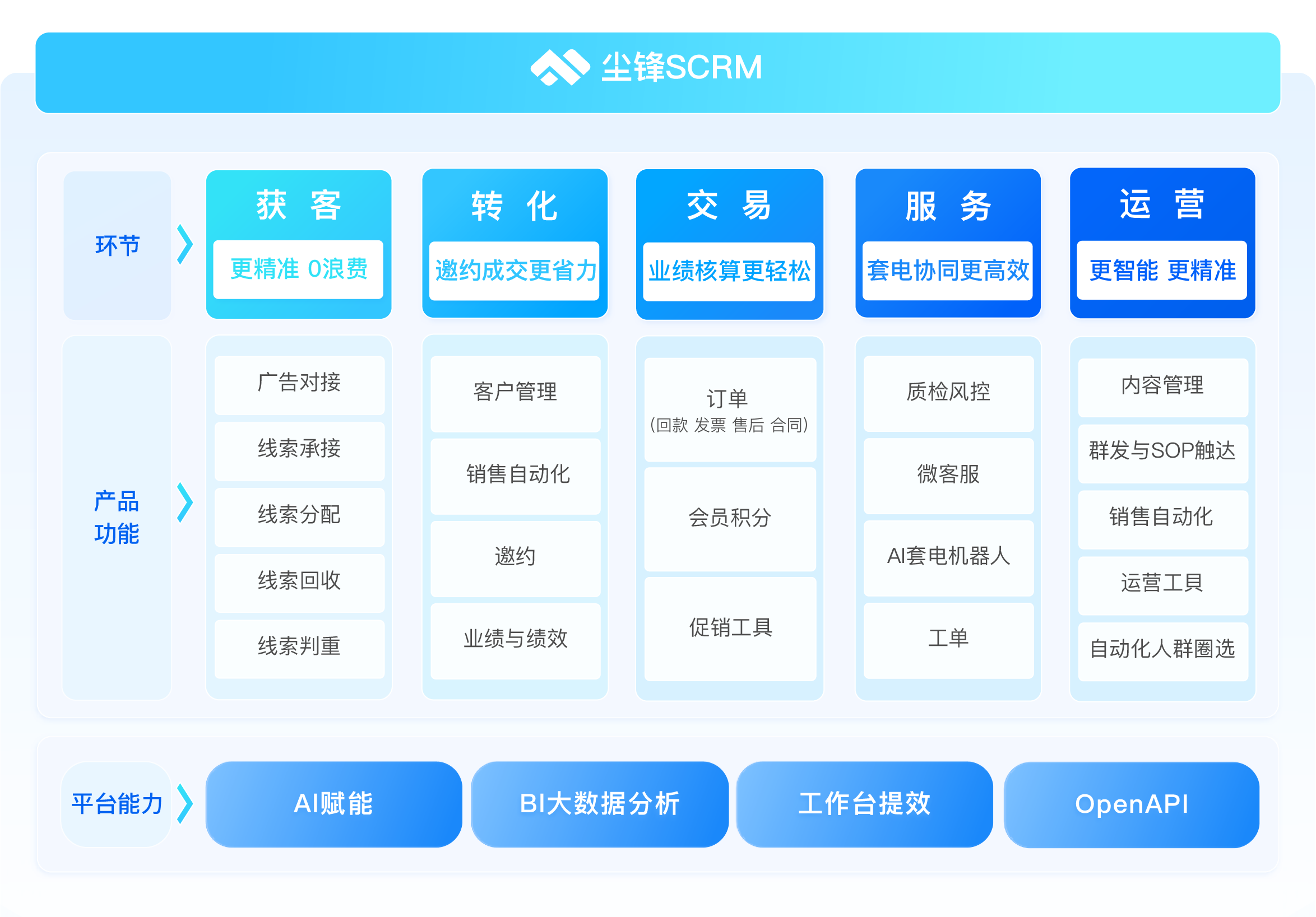 管理者要牵头明确三件事:首先,梳理获客-转化-成交-服务-复购全流程痛点,明确客户管理、私域运营、数据复盘、跨岗协同等场景需要解决的问题;第二,锁定必备功能,判断渠道活码、客户标签、群发触达、数据看板等基础能力,是否贴合企业日常运营习惯,数据指标是否满足管理需要;第三,评估产品能否串联业务环节、绘制精准转化漏斗,能否精准穿透业务环节。以尘锋SCRM为例,作为企业微信官方服务商,尘锋SCRM已打通从线索对接-销售跟进-成交转化-服务运营全业务环节,线索从进线到销售跟进、沟通详情、转化进展均系统记录,通过绘制精准转化漏斗,帮助管理者在串联全业务链路同时统计出真实的业务数据,基于线索质量、转化卡点,用真实数据推动科学决策,持续提升转化率。