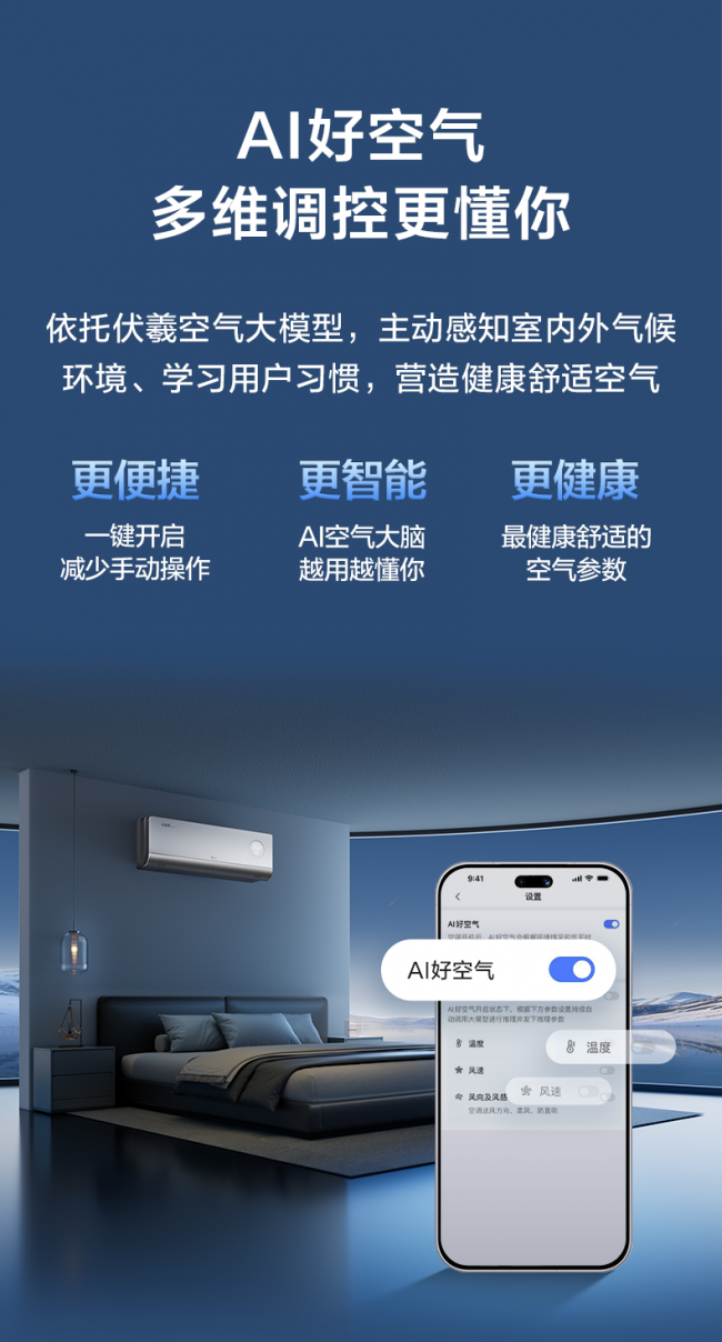 此外,一键AI好空气功能依托伏羲空气大模型,可主动感知室内外气候环境、学习用户习惯,营造健康舒适空气;AI恒温除霜采用高效薄霜速溶控制算法,解决冬季外机频繁滑爽困扰,告别忽冷忽热;智能除湿功能,智能识别桑拿天、梅雨季、回南天等特殊天气场景,自动匹配除湿模式,确保四季干爽。