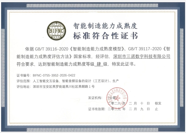 就在不久前,三诺智慧声谷的智造实力,还获得了权威认证加持。成功斩获了智能制造能力成熟度四级(优化级)认证,该认证体系最高为五级,目前国内暂无企业获得,四级为行业当前优秀水平。这也充分印证了三诺在非标自动化集成、多品种小批量柔性智造、声学主动降噪测试等环节的扎实功底。