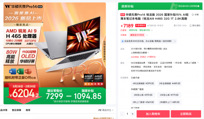随着日常用机场景的不断拓展,一台在性能、屏幕、便携、续航、AI等方面都表现优异的笔记本电脑,才是能覆盖学习、办公、创作、娱乐全场景的首选机型。强推华硕无畏Pro14 2026不仅将80W满血性能、1100nits OLED华硕好屏装进1.39kg轻薄机身,还标配32GB大内存、1TB高速存储,内置AI助手,无论是学生党日常学习、职场人移动办公,还是内容创作者专业创作,都能一站式满足需求,叠加至高15%国家补贴后到手6204.2元起。