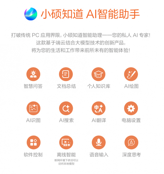 身处AI时代,华硕无畏Pro14 2026还内置“小硕知道”AI智能助手,不仅能实现智慧问答、文档总结、个人知识库、AI绘图、AI识图、AI搜索、AI翻译等实用提效功能,还能进行电脑设置、软件控制等,成为你日常用机的贴心管家。