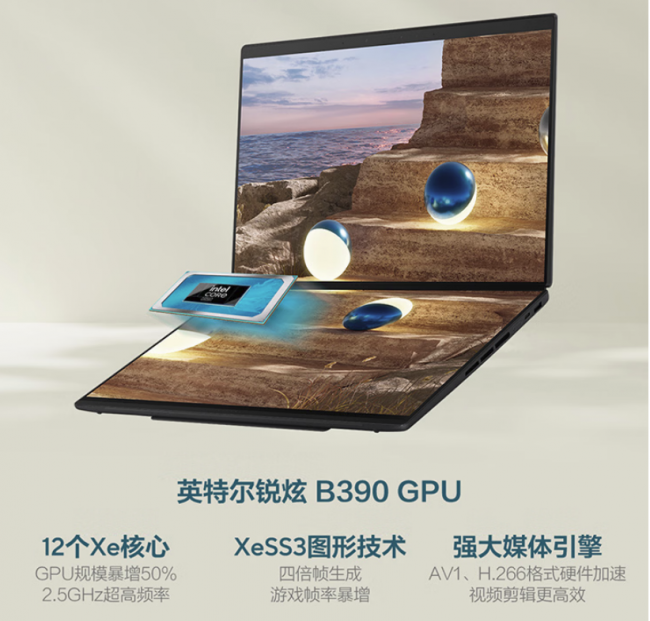 同时,第三代英特尔酷睿Ultra X9处理器采用全新Xe3架构的英特尔锐炫Arc B390核显,12个Xe核心的配置,让图形处理能力得到进一步提升,满足视频剪辑、照片修图等图形渲染工作的需求;它还支持XeSS3图形技术,可实现4倍帧率的大幅跃升,搭配实时光线追踪技术,能够渲染出更加逼真的光影效果,无论是游戏娱乐还是光影渲染,都能为用户带来沉浸式的视觉体验;此外,该处理器支持AV1、H.266编码,在确保视频高清画质的同时,有效减小视频体积,加快视频输出速度。值得一提的是,其AI算力也实现了大幅提升,内置英特尔AI Boost NPU,CPU、GPU、NPU三大AI引擎协同工作,拥有高达180TOPS的AI总算力,在进行AI运算时,效率更高,功耗更低。