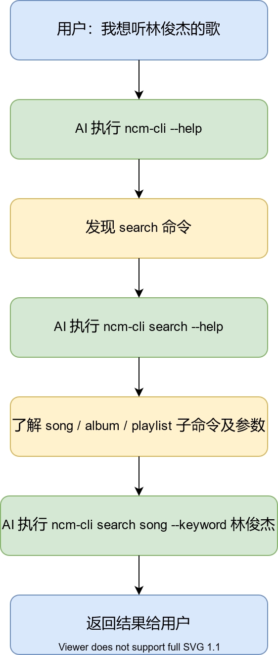 AI 拿到任务后,会先执行ncm-cli --help看顶层有什么,再根据需要钻进具体子命令查参数,最后再执行。整个过程和人一次用一个新 CLI 工具的探索方式完全一样。