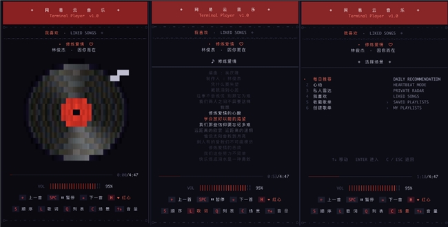 TUI 播放器是我们比较喜欢的功能之一——黑胶旋转动画、卡拉 OK 风格歌词同步、场景切换,在终端里有一种莫名的仪式感。