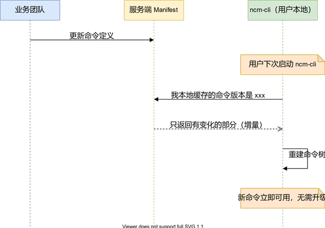 ncm-cli 引入了一套动态命令系统,核心思想是:把命令的定义从代码里移到服务端。