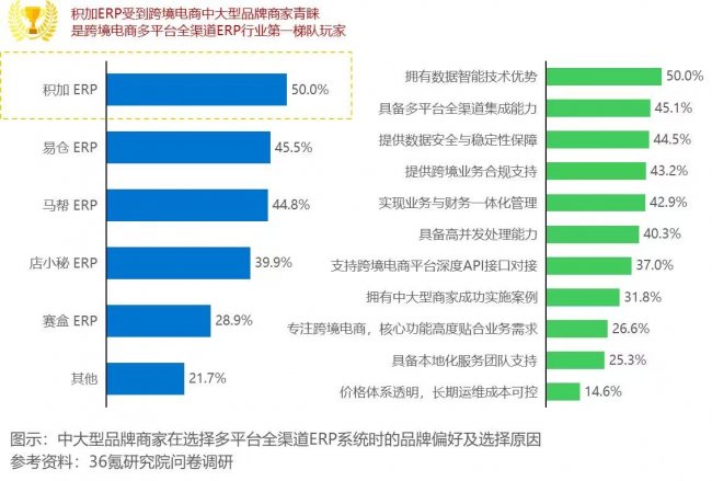 报告指出,积加ERP是跨境电商多平台全渠道最具代表性的数字化解决方案服务商,以50%的占比,成为最受跨境电商中大型品牌商青睐的跨境电商多平台ERP,稳居一梯队。