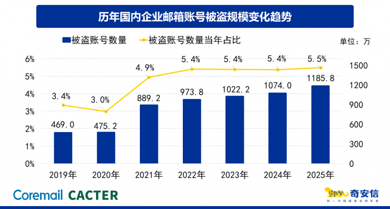 2025年,国内企业邮箱账号被盗规模达1185.8万个,同比增长10.4%,连续6年增长,占活跃邮箱账号总量的5.5%。其中,暴力破解占邮箱异常登录行为的52.5%,虽较2024年的略有下降(53.7%),但攻击者已从盲目撞库转向聚焦弱口令、未启用多重验证的高危账号,攻击成功率始终居高不下。