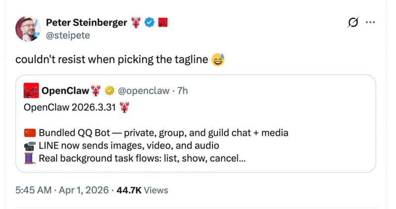 今日凌晨,OpenClaw发布v2026.3.31新版本,此次更新内置QQ Bot官方插件。这意味着,QQ成为国内首个被OpenClaw官方原生接入的社交平台。腾讯轻量云协同QQ团队贡献的QQ Bot代码也已合入OpenClaw主仓库。随即,OpenClaw创始人Peter也对这一消息进行公开点赞。