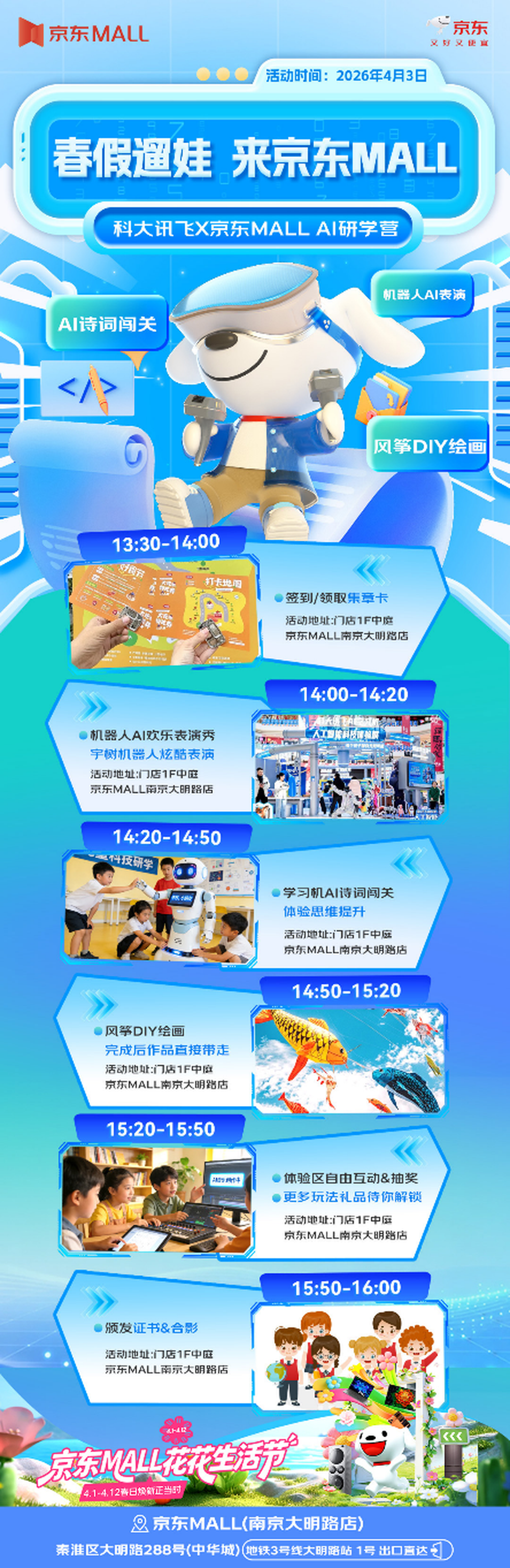 不少家长表示,相比单纯出游或在家娱乐,这类家门口的科技研学活动更具吸引力——既避免了长途出行的疲惫,又能让孩子在轻松氛围中接触新知识,提升综合能力。4月3日,由南京晨报、京东 MALL 南京大明路店联合科大讯飞打造的 “春假遛娃 来京东MALL” AI研学营将正式开营,为小朋友们带来一场集科技体验、创意实践、趣味闯关于一体的沉浸式研学活动,用AI赋能成长,解锁春假遛娃新选择。