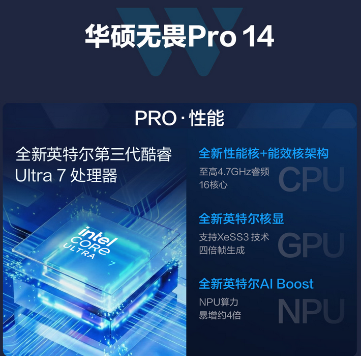 华硕无畏 Pro14 酷睿版 2026 搭载英特尔酷睿 Ultra 7 356H 处理器,同属第三代 Panther Lake 架构,由 4 个超大核 +8 个大核 +4 个能效核组成的 16 核心 16 线程设计,最高睿频 4.7GHz,65W 满血性能输出。