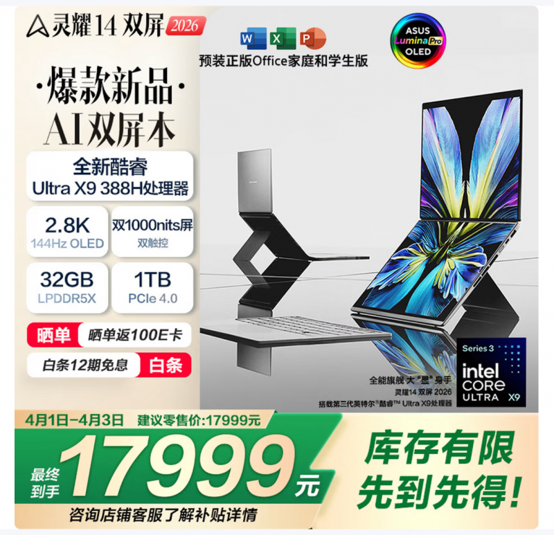 快节奏时代,移动办公需求激增,传统笔电的性能表现、便捷性以及单一屏幕的交互局限,大幅影响工作效率。华硕灵耀14 双屏 2026以双屏设计和强劲性能,重构生产力流程,它搭载双2.8K 144Hz 1000nits OLED 触控华硕好屏、第三代英特尔酷睿Ultra X9 388H处理器、99Wh双电池等配置,轻薄美学机身融合强劲性能、卓越视野、持久续航,为职场精英带来全新、高效、便捷的工作体验,打造全场景智慧办公新范式。当前购机,支持晒单返100E卡、白条12期免息福利,到手17999元。