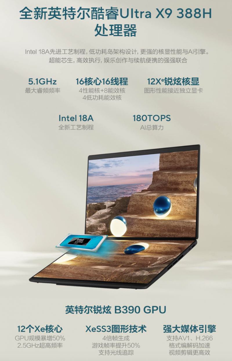 为支撑双屏高负载运行,灵耀14 双屏 2026采用第三代英特尔酷睿Ultra X9 388H处理器,基于先进的Intel 18A制程工艺,拥有16核心16线程设计,最高主频可达5.1GHz。内置英特尔锐炫B390 GPU,拥有12个Xe核心、XeSS3图形技术、强大媒体引擎,图形性能媲美独立显卡,足以轻松应对视频剪辑、3D建模等创意工作场景下的图形密集型任务;英特尔AI Boost NPU,协同CPU、GPU提供至高180 TOPS AI总算力,进一步加速本地AIGC创作效率。搭配内置的“小硕知道”AI智能助手,基于端云结合大模型技术,支持断网环境下使用,并带来智慧问答、文档总结、AI绘图、AI识图、AI文件搜索、AI翻译等功能,助力轻松实现内容总结与生成、快捷问答、艺术创作等工作任务,为生活和工作带来前所未有的智能体验。