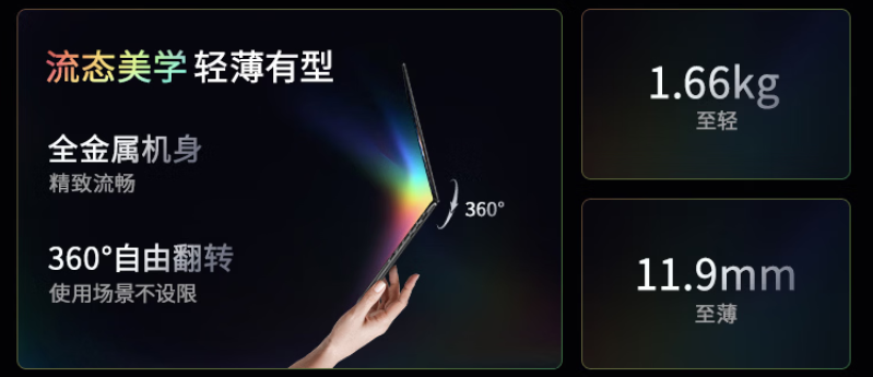 整机厚度 11.9mm,重量 1.66kg,成为三款中最轻薄的存在。全铝合金机身兼顾质感与耐用性,契合商务精英对品质与可靠性的双重期待。