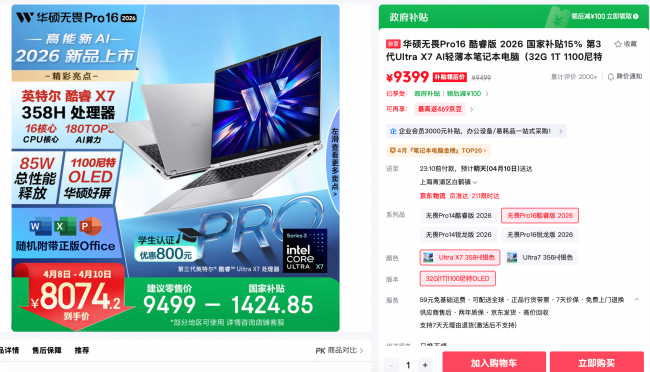 当AI全面渗透学习、办公与创作的每一个环节,一台能兼顾强悍性能、出色屏幕、超长续航与智能体验的高能AI笔电,成为了当代学生与职场人的首选。华硕无畏Pro16 2026搭载第三代英特尔酷睿Ultra X7处理器、1100尼特OLED华硕好屏与AI智能助手,拥有85W性能释放,以高能表现轻松覆盖全场景用机需求。当前购机,部分地区可享至高15%国家补贴,到手价8074.2元,通过学生认证还可优惠800元。