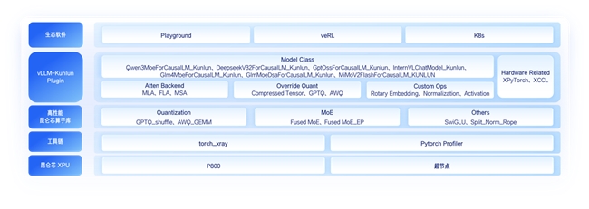 为实现高性能模型的快速开发与适配,百度百舸联合昆仑芯开发了 vLLM-Kunlun Plugin,将 vLLM 社区版与昆仑芯 XPU 后端完全解耦。用户通过 vLLM-Kunlun Plugin,快速适配主流开源模型。
