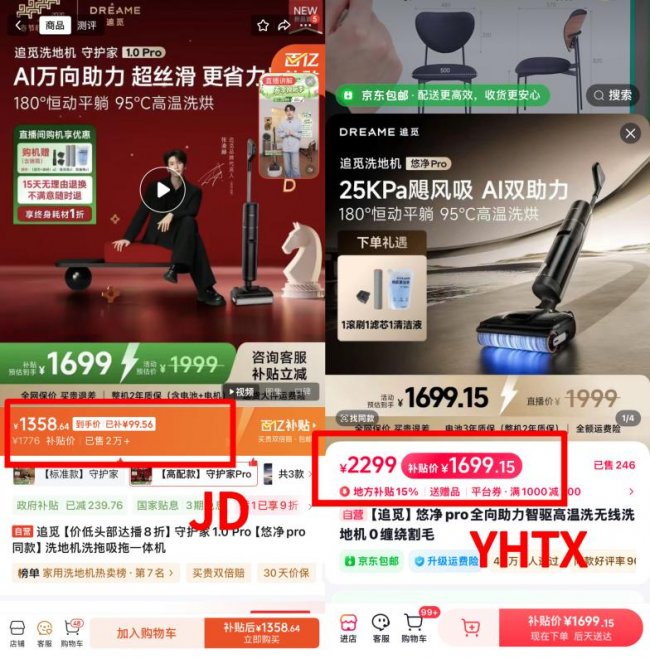 追觅守护家1.0Pro,在JD叠加政府补贴、平台券和限时优惠后,实际到手价仅为1358.64元。而在【与辉同行】直播间,同款产品售价为1699.15元,两者相差340.51元,JD价格相当于直播间的8折。