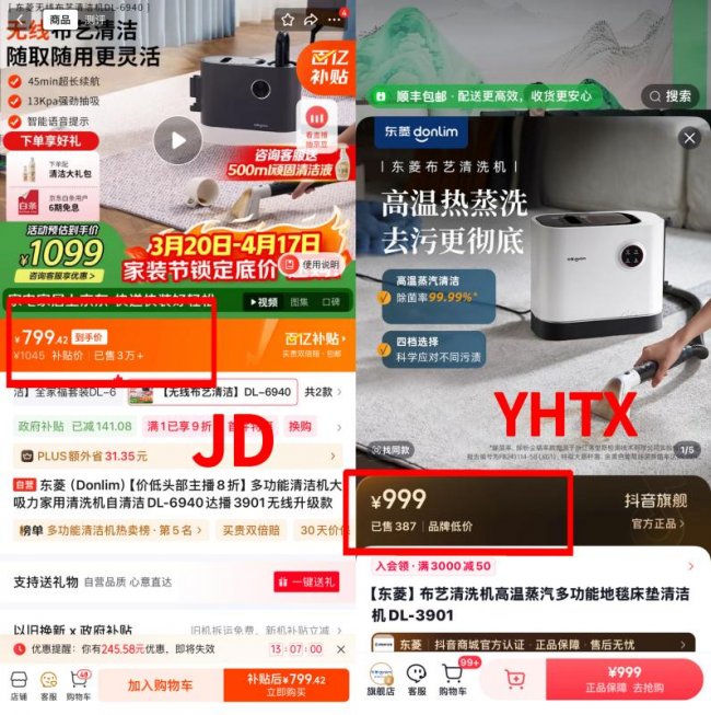 再看东菱无线布艺清洗机,JD叠加政府补贴和PLUS会员额外优惠后,到手价低至799.42元。而【与辉同行】直播间同款999元,两者相差200元,JD相当于打了8折。
