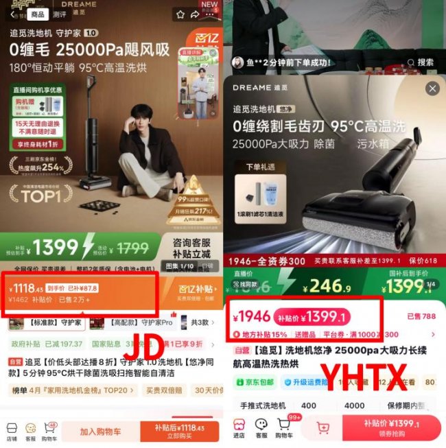 另一款追觅守护家1.0标准款,JD最终到手价为1118.43元,而【与辉同行】直播间同款卖到1399.1元,价差280.67元,京东便宜了20%。通过JD购买这两款洗地机,均可享受整机2年质保、终身耗材1折权益以及15天无理由退换,直播间则很难提供同等力度的售后保障。