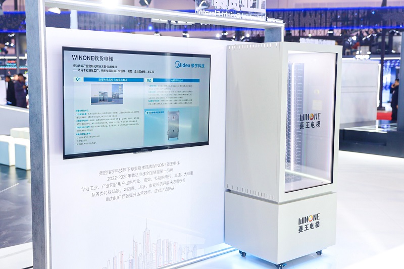 工业货梯领域,美的展示全球载重量第一的落地应用货梯——菱王50吨超大载重电梯,支持集装箱、货车直接“上楼”,省去二次转运,提升物流效率,破解超重载货垂直运输难题。