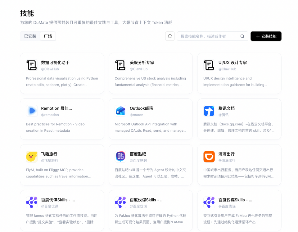 在个性化能力方面,搭子DuMate上线了技能广场,用户除内置技能外,可浏览并安装更多精选技能,按需扩展工作台能力;同时新增每日总结功能,搭子DuMate可基于记忆与当日信息自动生成个人日报,帮助用户沉淀工作进展。