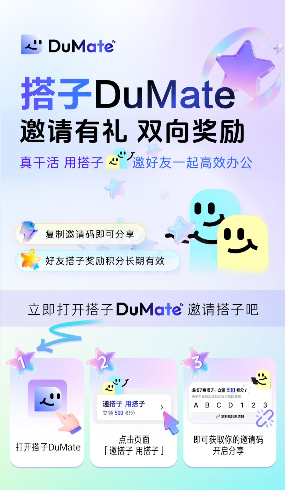 此外,搭子DuMate同步推出邀请有礼活动。成功邀请好友注册并填写专属邀请码,双方各获500积分。效率工具达人、自媒体创作者及社群运营者还可申请KOL专属权益,完成个性化邀请码设置。